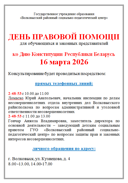 Главная Новости День правовой помощи для обучающихся и законных представителей ко Дню Конституции Республики Беларусь 16 марта 2026 День правовой помощи для обучающихся и законных представителей ко Дню Конституции Республики Беларусь 16 марта 2026 06 марта 2026